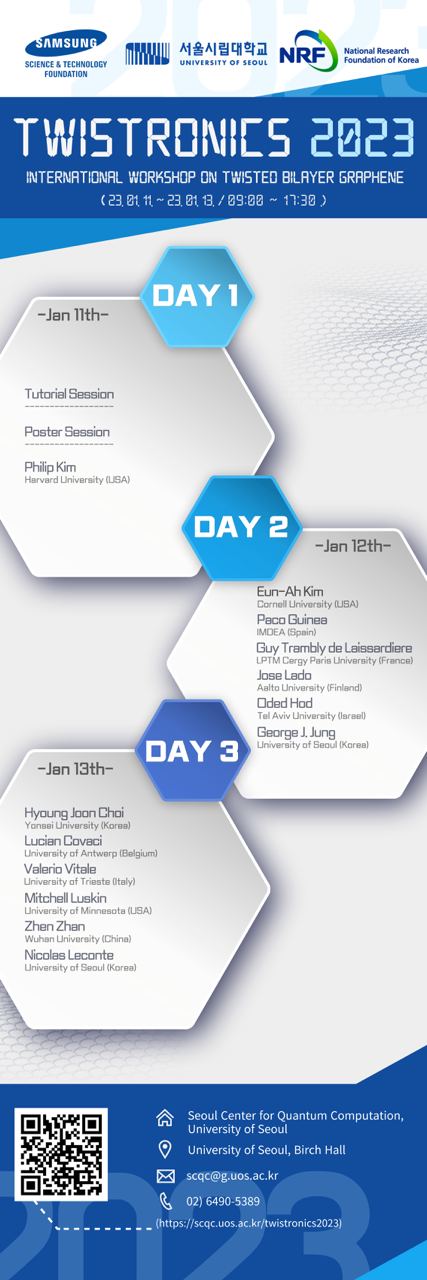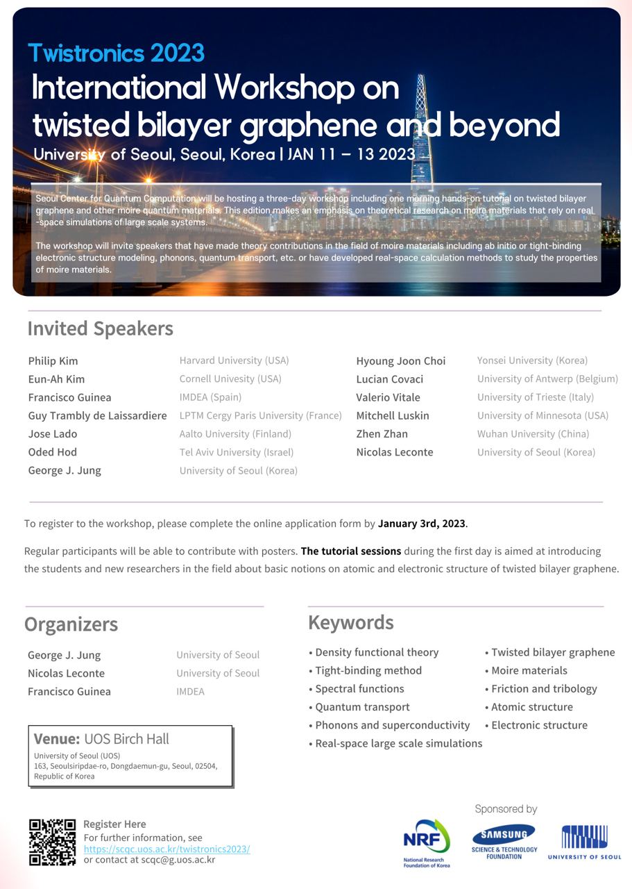 Posted inEvents Gallery University Events Workshop Twistronics 2023 Posted by By YY Ahn April 14, 2023No Comments International Workshop on twisted bilayer graphene and beyond Univesity of Seoul, Seoul, Korea | Jan 11 – 13 2023 Seoul, Korea | Jan 11 – 13 2023 Twistronics 2023 | International Workshop on twisted bilayer graphene and beyond University of Seoul, Seoul, Korea | Jan 11 – 13 2023 click click click *Homepage LInk :Twistronics 2023: International Workshop on twisted bilayer graphene and beyond – SCQC (uos.ac.kr) YY Ahn Department of physics, staff View All Posts Post navigation Previous Post Physics Day Support Plan GuideNext PostThe 30th anniversary of the Department of Physics